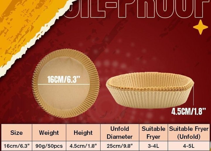 Our air fryer paper liner is thick enough to withstand the baking time! It is oil-proof, water-proof, non-stick and not easy to damage, suitable for all your baking needs. These disposable paper liners can effectively keep food residue away from fryer and make it as clean as unused, saving time and effort. These paper liners are must have if you hate cleaning after baking. Using food grade parchment, it is waterproof, oil-proof, non-stick, 100% healthy and with nice heat resistant, can withstand temperatures up to 428 degrees Fahrenheit. And it has no effect on the taste of food. Including 50pcs of paper liners, sufficient quantities offer a wide range of choices for your daily cooking, baking and replacement needs. Just throw away the paper liner after use. No need to clean the fryer anymore. Suitable for air fryer, microwave, oven, steamer, cooker, etc. The paper liners can be applied for baking, roasting, frying, or serving food, suitable for home baking, camping, BBQ, summer party, and so on, lightweight and practical. Material: Silicon Paper, Pulp Paper. Features: Food Grade, Waterproof, Oil-proof, Non-stick; Diameter: 16cm/6.3; Height: 4.5cm/1.8; Package Includes: 1*Air Fryer Disposable Paper Liner(50pcs).