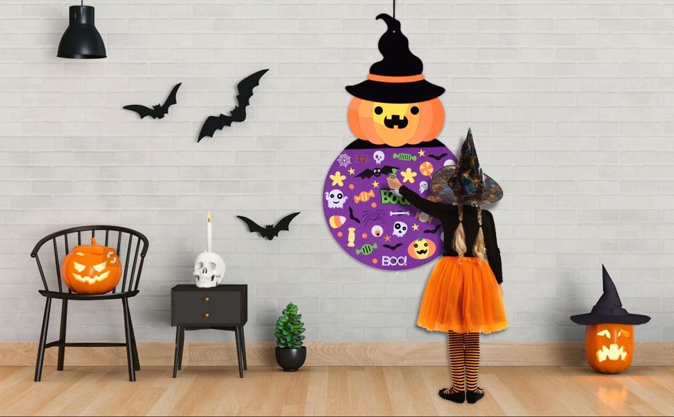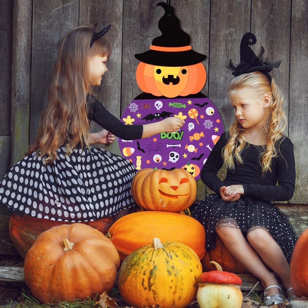 Halloween just got more fun with this Felt Halloween Pumpkin Witch to decorate! FUN- This felt Halloween Witch goes along with any holiday decor. Children and adults will find this interesting and fun to decorate. COLORFUL- The Halloween is a time for giving and sharing, the simple decor reminds us the spirit of the season is all about love and joy of being together with your loved ones. A GREAT GIFT FOR LEARNING TOO - This activity is fantastic to practice hand use, vocabulary, hand eye coordination, fine motor skill & color recognition, will be the perfect gift for your little toddler for Halloween. How are they packed? The set is sent folded, when it arrives, you can use an slightly warm iron to make it perfect and ready to hang on a wall or door. What's Included? The base Pumpkin witch and all the accessories you see to decorate. This comes ready to use. What are they made out of? All components are high quality durable felt. It can be hung on a wall or door or play on the floor. They can be put away and reused again year after year. Are they reusable? Yes! You can pack them away and reuse them year after year. Do they stick directly to the wall? This DOES NOT directly stick to the wall. There is a loop at the top you can use to hang it up. You hang it on the wall or door, so nothing gets ruined. Use a hook, a nail or a wreath hanger. The choice is yours. You can also use command strips or double stick tape or tacks to secure it more if you wish. They do not need to stick to the wall for play. The kids also loved using them just layed out on the floor. Who enjoys this? Perfect for day cares, schools, churches and homes. Great for children over 3 years old. The creative pieces are useful to build and unlock a childs imagination. Please do not allow children to put the felt pieces in their mouth. Please supervise small children.